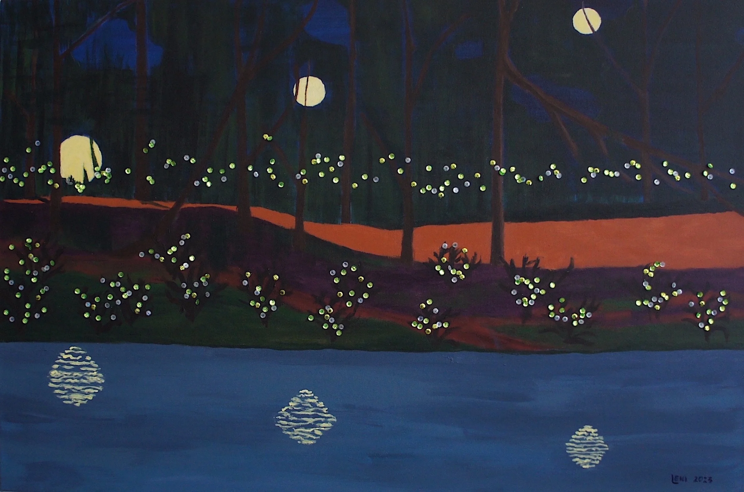 You can also ask me about my “sequins as fireflies” paintings. These tend to be more fantastic than realistic (see “Moonrise/Fireflies”), and they are great in a child’s bedroom, as the sequins reflect even very low levels of ambient light.
